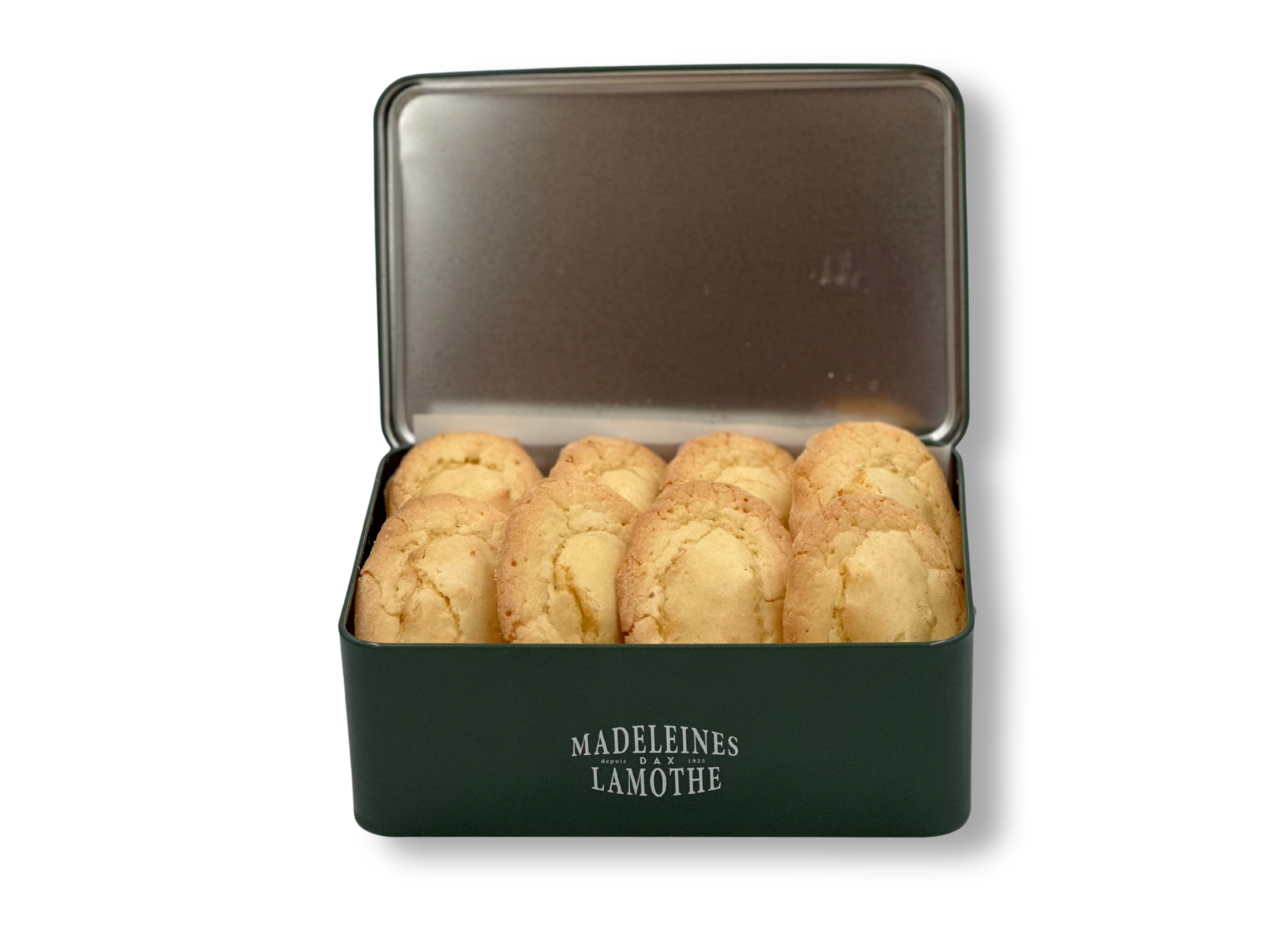Ce coffret métal unique renferme, au choix, 12 madeleines traditionnelles ou 20 mini madeleines Lamothe, véritables spécialités dacquoises depuis les années 1920.
