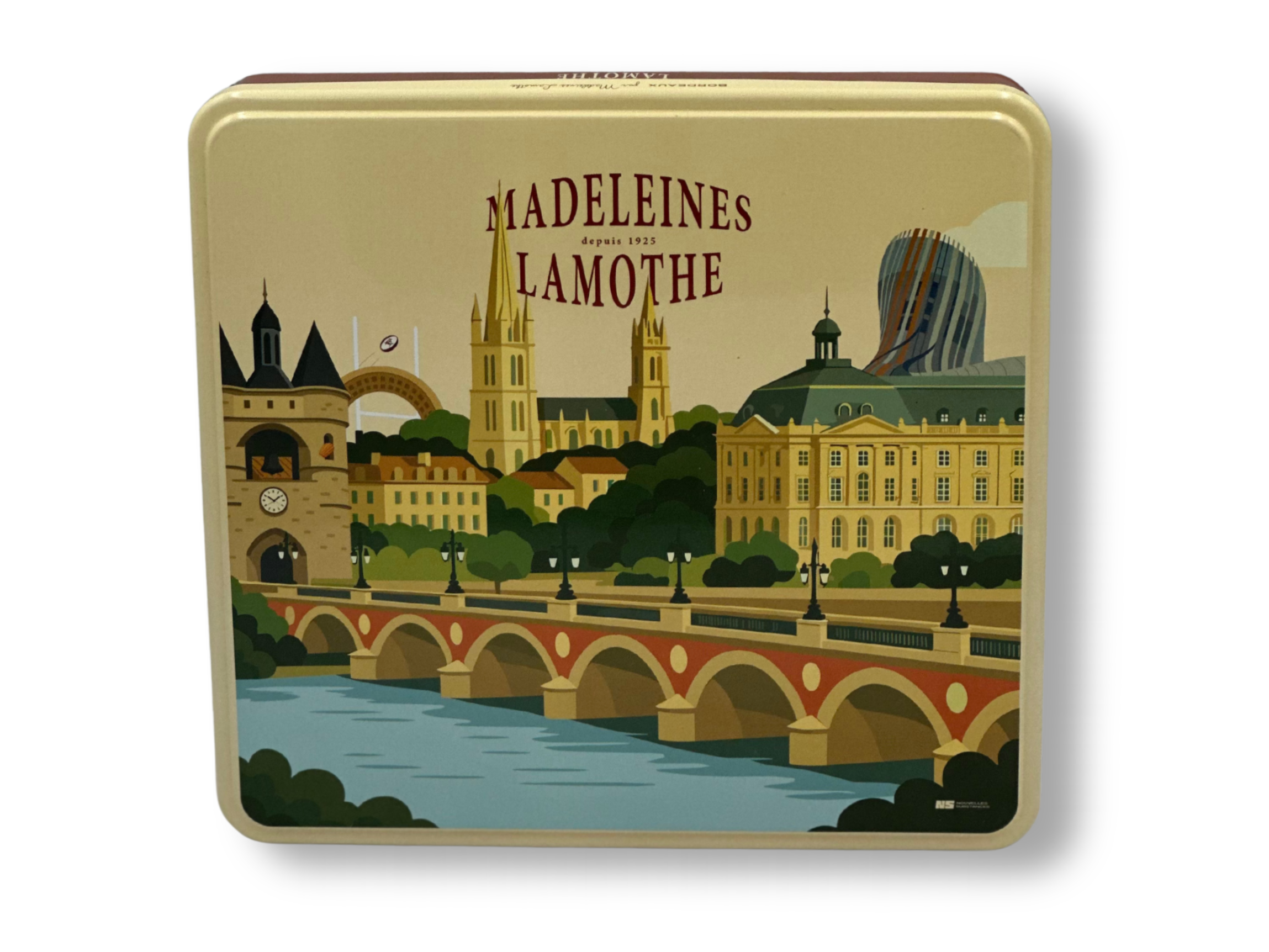 Ce coffret métal unique renferme, au choix, 15 madeleines traditionnelles ou 24 mini madeleines Lamothe, véritables spécialités dacquoises.